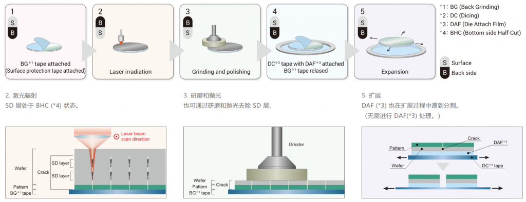 通過膠帶膨脹等行為在周邊方向上拉緊膠帶,對(duì)已形成 SD 層的晶圓施加外力。這會(huì)對(duì)晶圓的內(nèi)部裂紋狀態(tài)施加拉應(yīng)力,并使裂紋延伸到頂部和底部表面,從而分離晶片。由于晶圓分離是通過延伸裂紋進(jìn)行的,因此沒有應(yīng)力施加在器件上。此外,由于基本上沒有截口損失,這會(huì)提高芯片成品率。